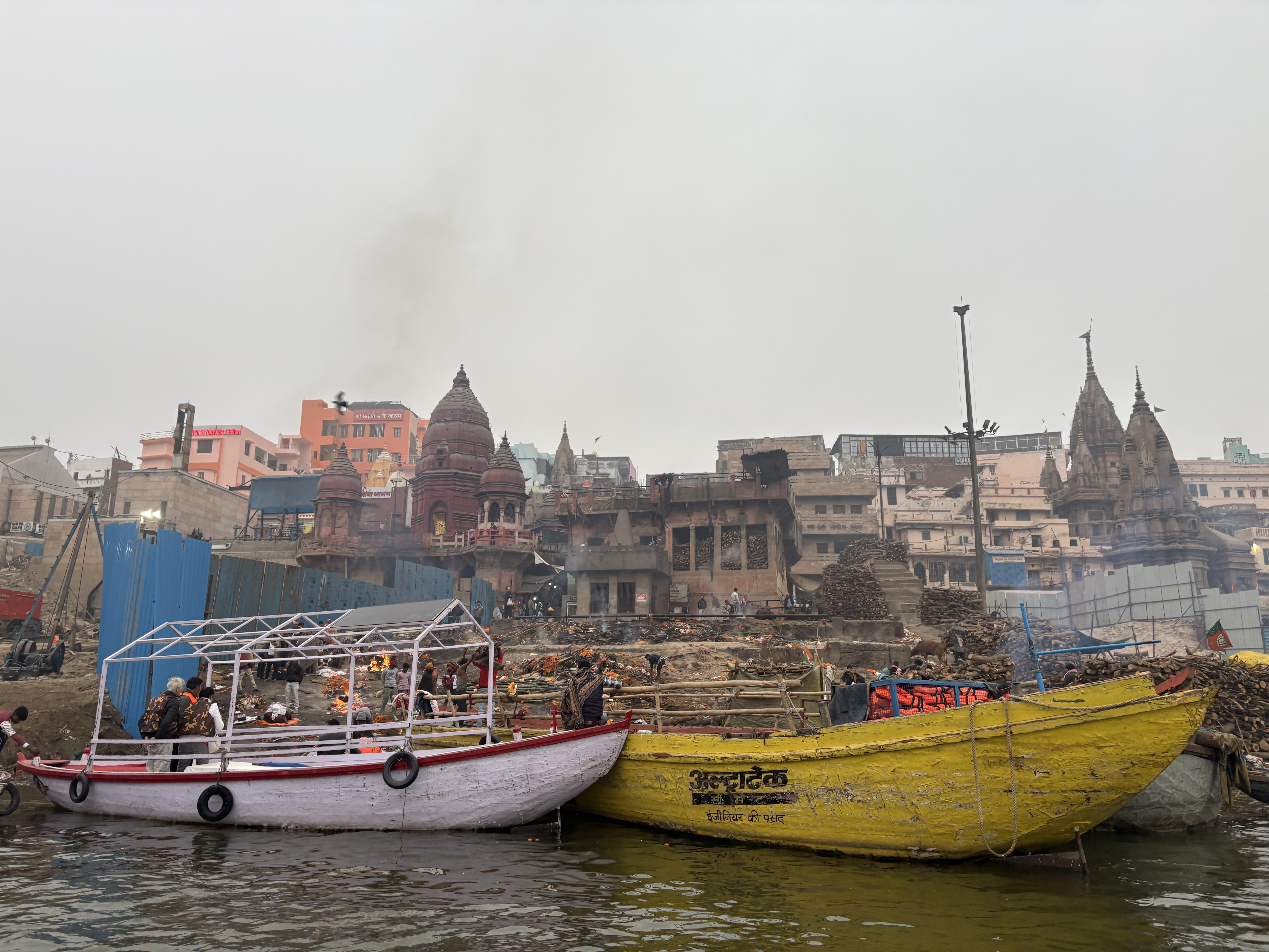 Varanasi is a holy city for Hindus, and it’s been a continuous settlement for 5,000 years. I had come here to see the ritual cremations on the Ganges river, of which my mom had spoken with mixed appreciation and revulsion recalling her own trip here in the 80s. I am fresh back from a 6 AM boat ride down the Ganges to see this rite performed, and let me tell you: I didn’t see much.