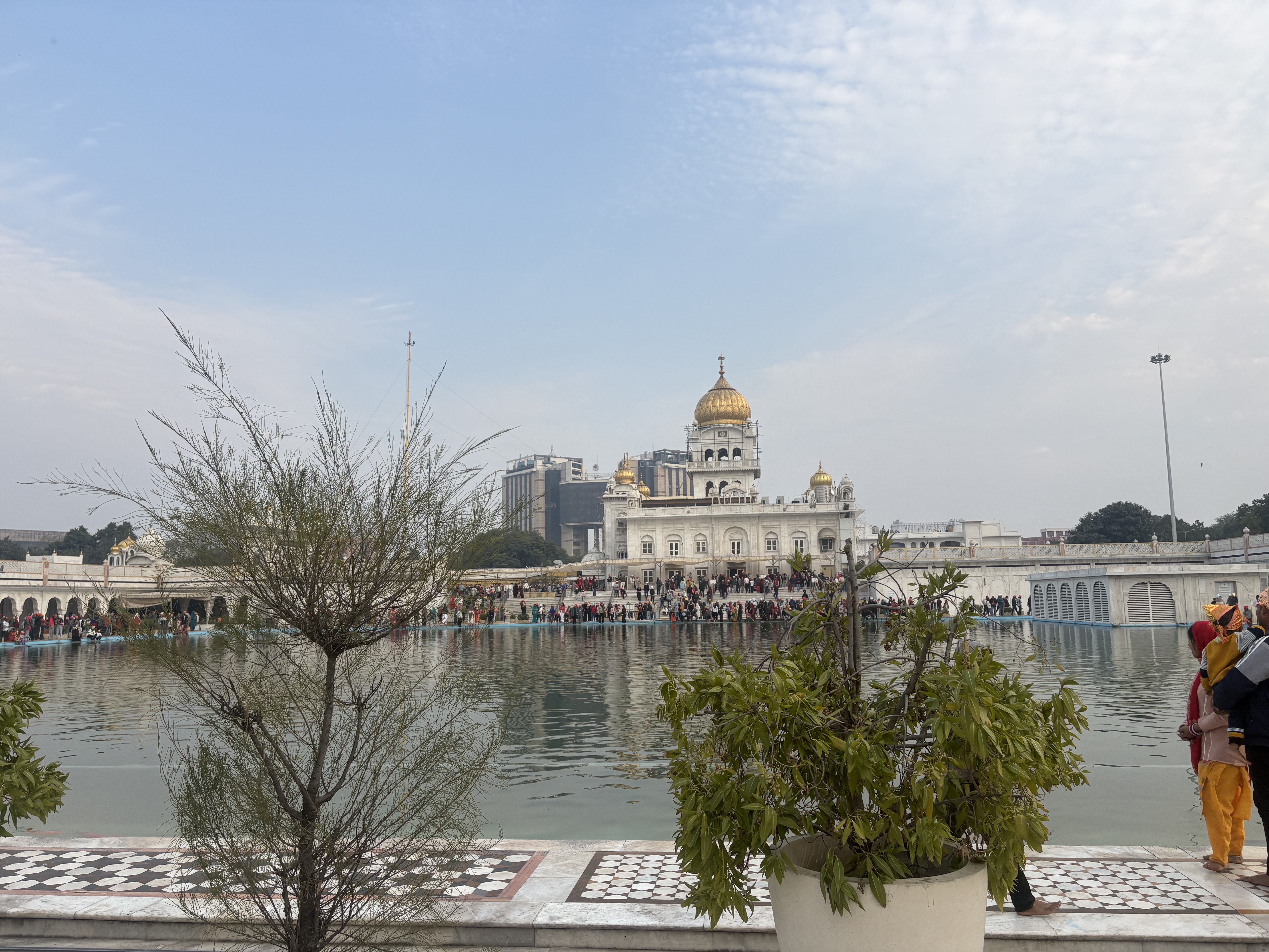 Ajay then took us to the incredible “Golden Temple” of the Sikhs. This was legitimately really cool: a temple with a gold roof and gold interior, a large reflecting pool, and thronged with thousands of worshippers. I later learned that the temple gives out free food every day, which may explain how packed it was. We participated in several minor rituals like touching our hands to the water in the reflecting pool and eating a mush-like dish out of our hands. I also saw a man climb a flagpole to slowly wrap it in some kind of cloth.